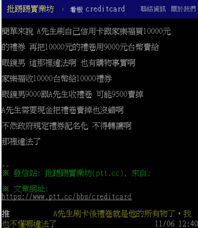 這位發文跟樓下的網友都認為買完東西後把東西賣給別人是沒問題的,畢竟禮券也沒有規定說轉讓違法。